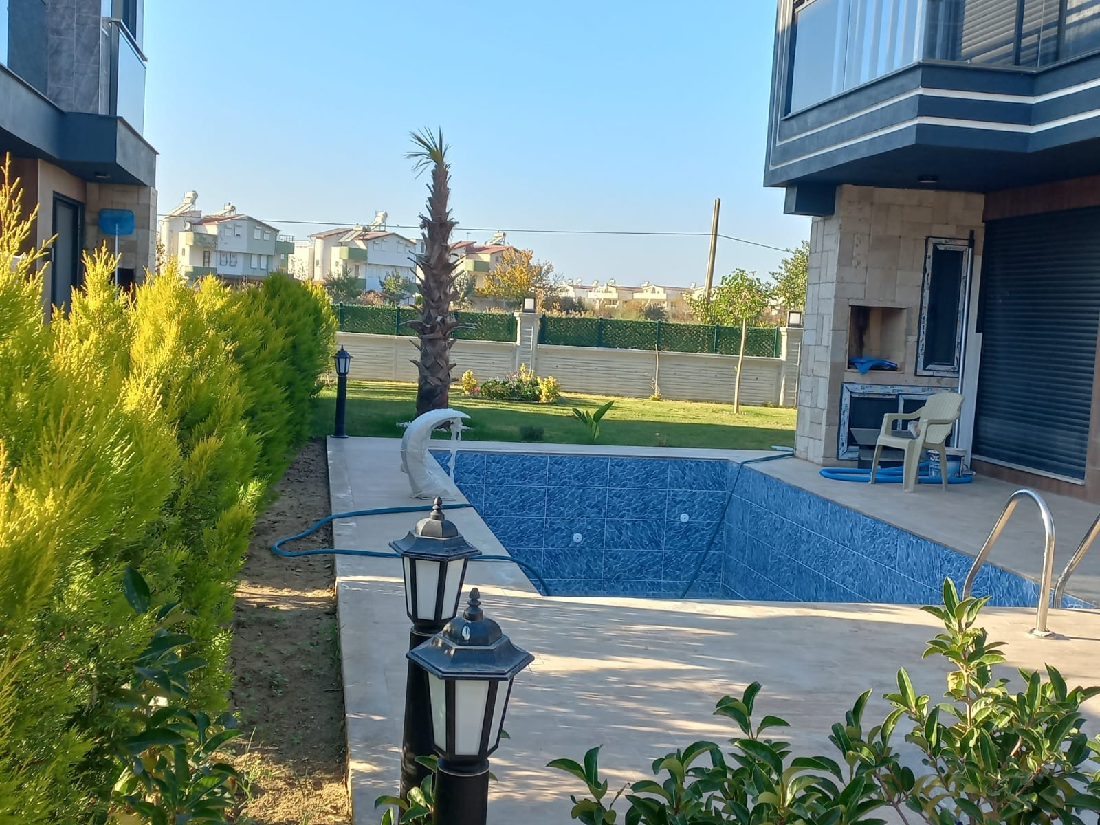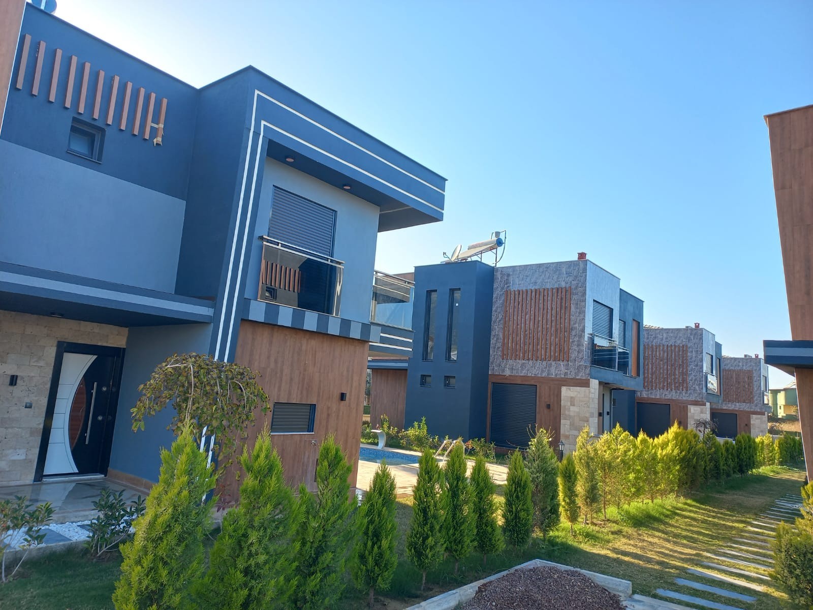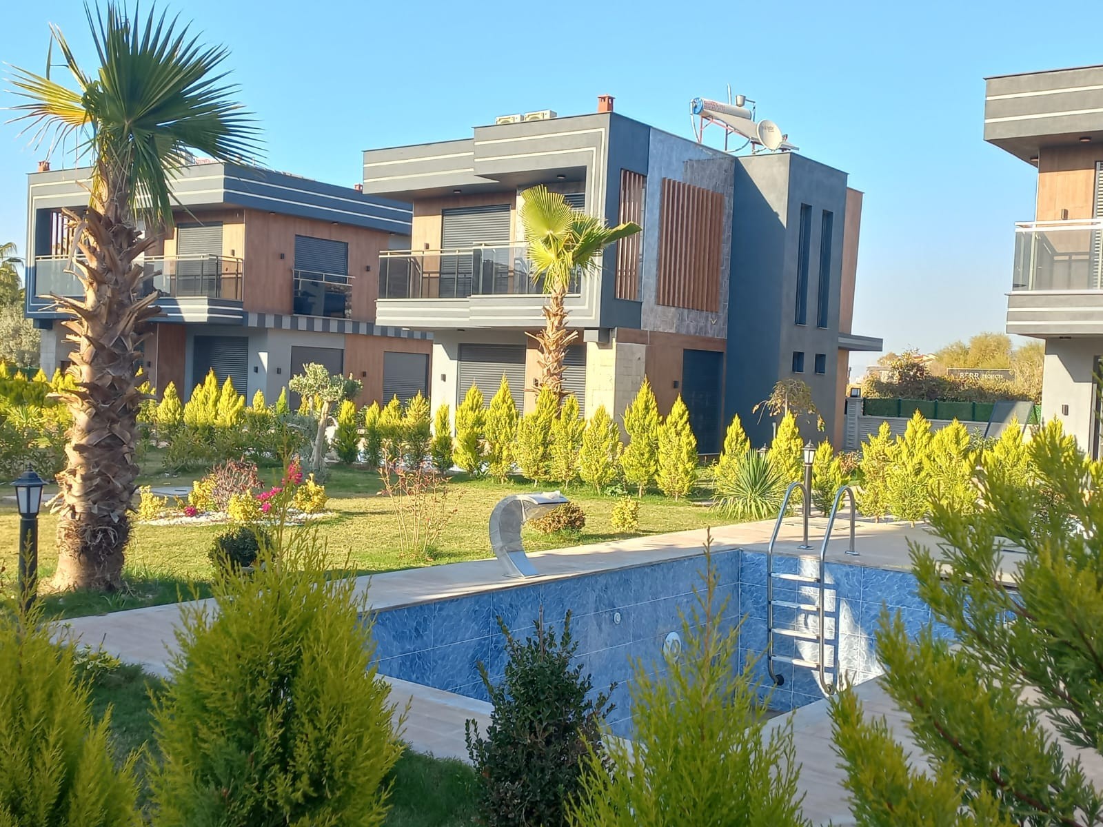 4+1 BÜRÜT 350m2 NET 240m2 3 SHOWER 1) Wonderful garden arrangement with very modern superfluous plant tree flower derivatives 2) The garden border area of each Villa is divided by Limoncypresses. 3) Private security cameras Smart system You can see our house from all over the world, control and manage it 4) Automatic shutter garage entrance 5) Pedestrian entrance outside door with video conversation 6) Kale brand steel door 7) Linearosso Aluminum doors and windows are heat and sound insulated, all with mosquito nets 8) Audi brand smart system blinds 9) Linea decor Kitchen furniture 10) Decorative interior doors with lacquer siensi embroidery 11) Wardrobes in the rooms 12) Bathrooms Hilton cabinets 13) Places Vitra ceramics 14) kitchen bathroom fountains toilet bowls sinks Vitra brand Luminaires . 15) Around the pool is covered with wooden deck. Versatile sitting areas by the pool 16) Pools balance tank engine room 17) Gorgeous waterfalls by the pool 18) Very stylish exterior cladding 19) Solar energy 20) combi 21) kilims 22) dishwasher 23) Washing machine 24) Built-in Oven 25) microwave oven 26) Generator against power cut 27) 20-ton water tank against water cut-off 28) Rainwater discharge tanks 29) Radial Foundation with 20 20 meters deep Bored Pile on the floors of each Villa in compliance with the earthquake regulations 30) Security room and cameras 31) Automatic garden lighting 32) Automatic garden irrigation 33) Private automatic shuttered garage entrance for each villa 34) BBQ for each villa 35) Underfloor heating CONTACT FOR MORE DETAILED INFORMATION 1 HOUR TO IZMIR 1 HOUR TO BODRUM DIDIM 30 MIN