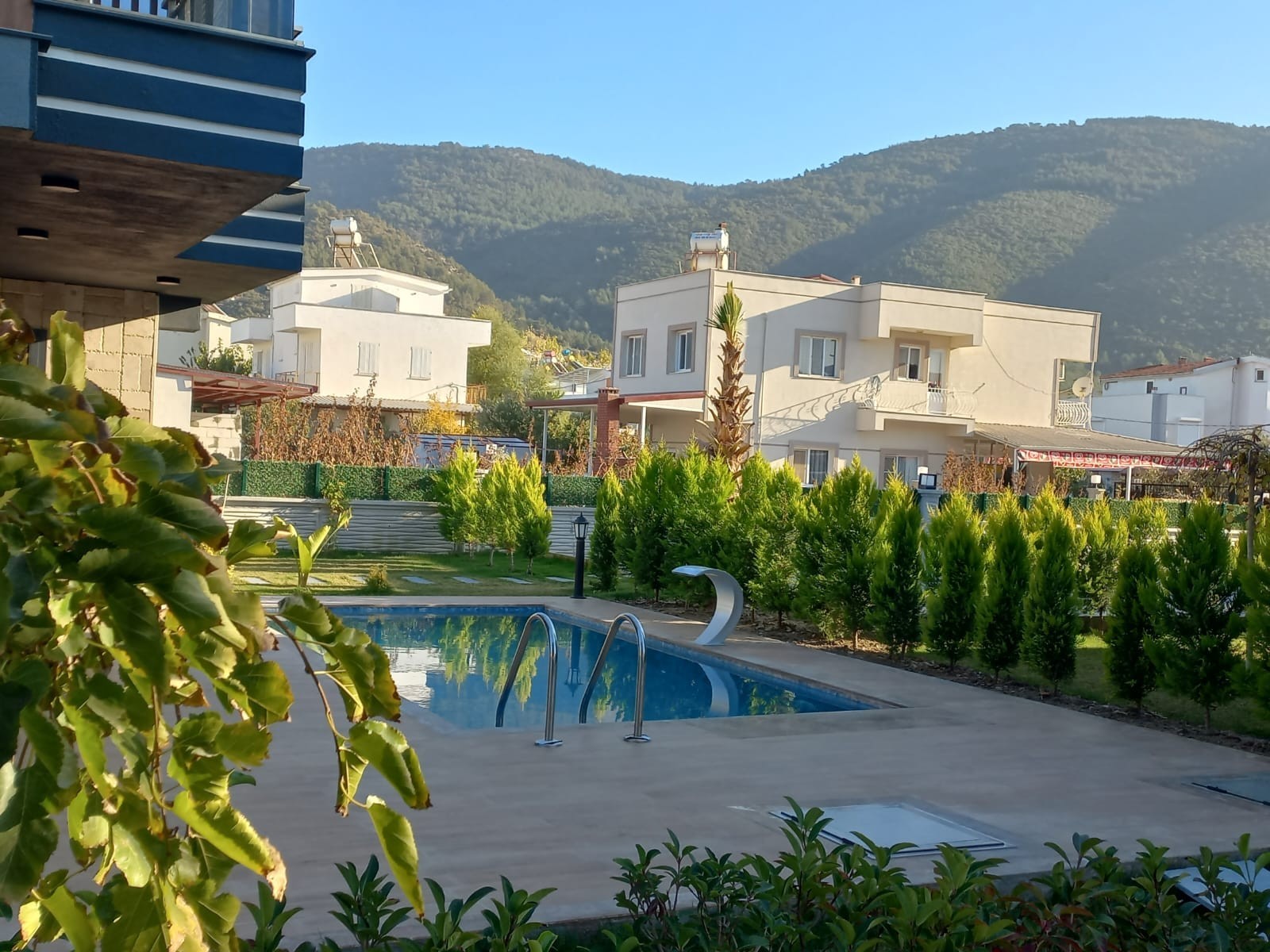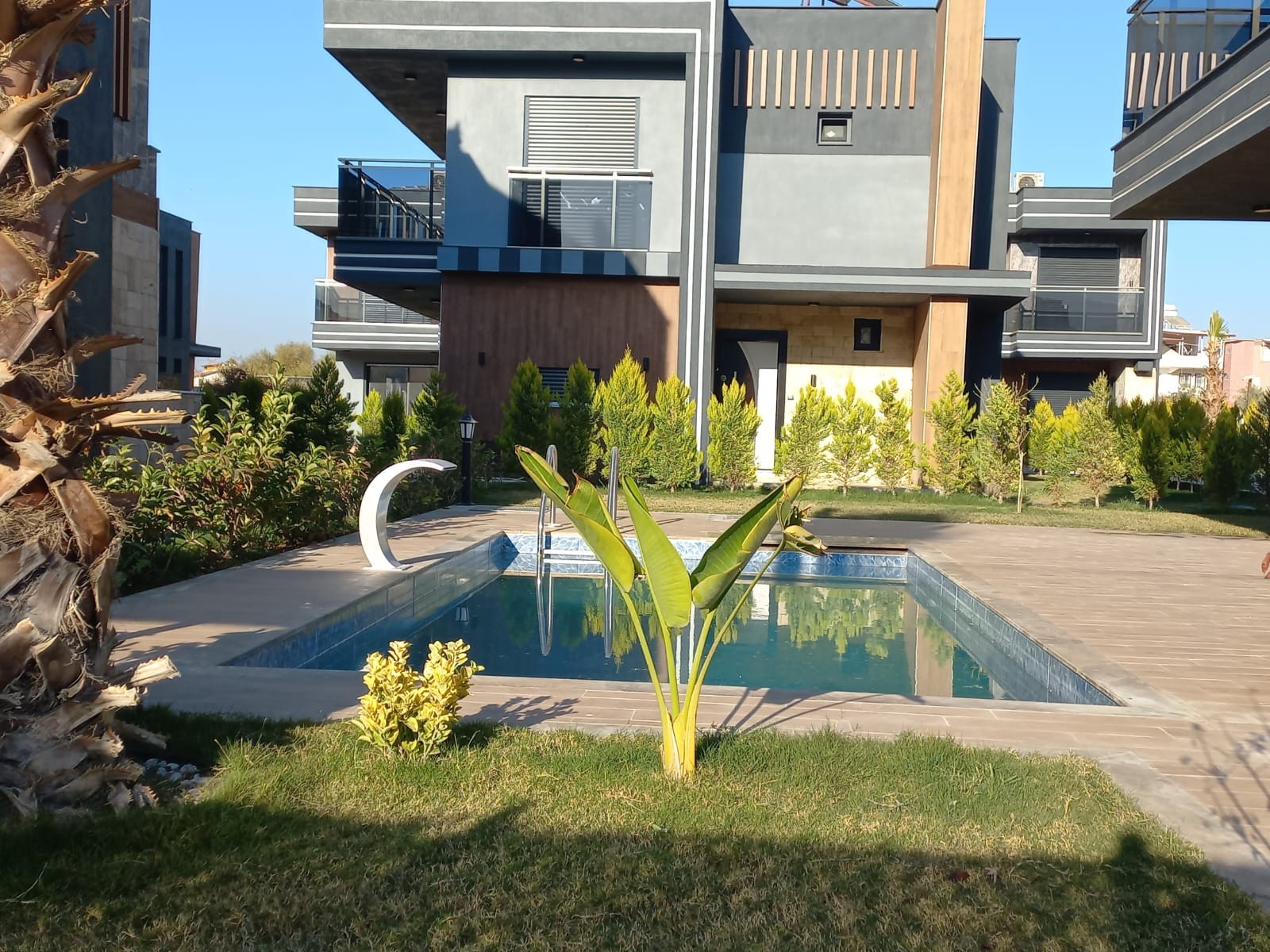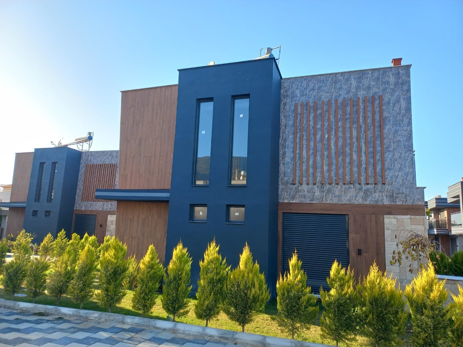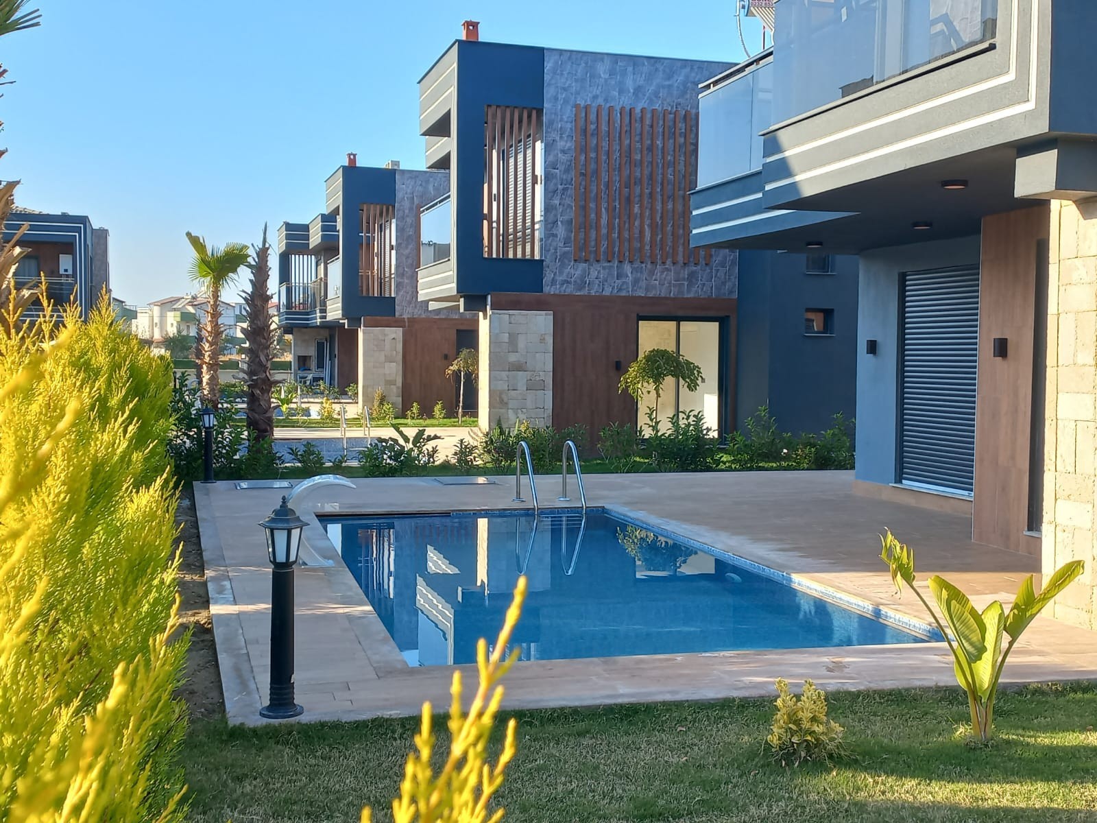 4+1 BÜRÜT 350m2 NET 240m2 3 SHOWER 1) Wonderful garden arrangement with very modern superfluous plant tree flower derivatives 2) The garden border area of each Villa is divided by Limoncypresses. 3) Private security cameras Smart system You can see our house from all over the world, control and manage it 4) Automatic shutter garage entrance 5) Pedestrian entrance outside door with video conversation 6) Kale brand steel door 7) Linearosso Aluminum doors and windows are heat and sound insulated, all with mosquito nets 8) Audi brand smart system blinds 9) Linea decor Kitchen furniture 10) Decorative interior doors with lacquer siensi embroidery 11) Wardrobes in the rooms 12) Bathrooms Hilton cabinets 13) Places Vitra ceramics 14) kitchen bathroom fountains toilet bowls sinks Vitra brand Luminaires . 15) Around the pool is covered with wooden deck. Versatile sitting areas by the pool 16) Pools balance tank engine room 17) Gorgeous waterfalls by the pool 18) Very stylish exterior cladding 19) Solar energy 20) combi 21) kilims 22) dishwasher 23) Washing machine 24) Built-in Oven 25) microwave oven 26) Generator against power cut 27) 20-ton water tank against water cut-off 28) Rainwater discharge tanks 29) Radial Foundation with 20 20 meters deep Bored Pile on the floors of each Villa in compliance with the earthquake regulations 30) Security room and cameras 31) Automatic garden lighting 32) Automatic garden irrigation 33) Private automatic shuttered garage entrance for each villa 34) BBQ for each villa 35) Underfloor heating CONTACT FOR MORE DETAILED INFORMATION 1 HOUR TO IZMIR 1 HOUR TO BODRUM DIDIM 30 MIN